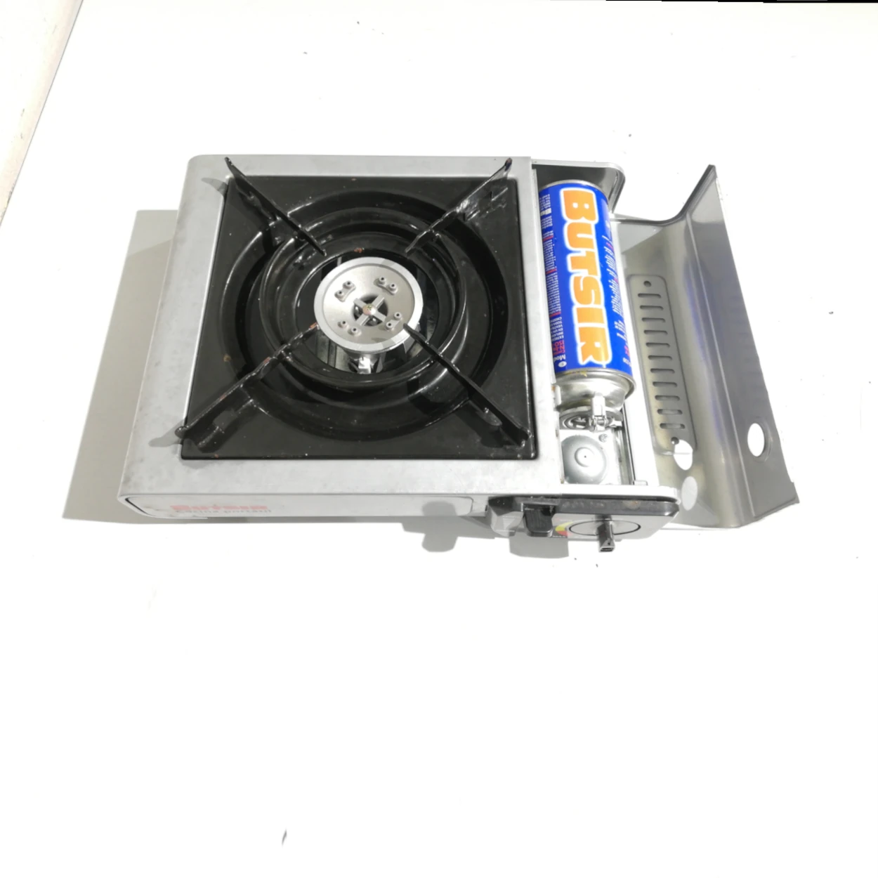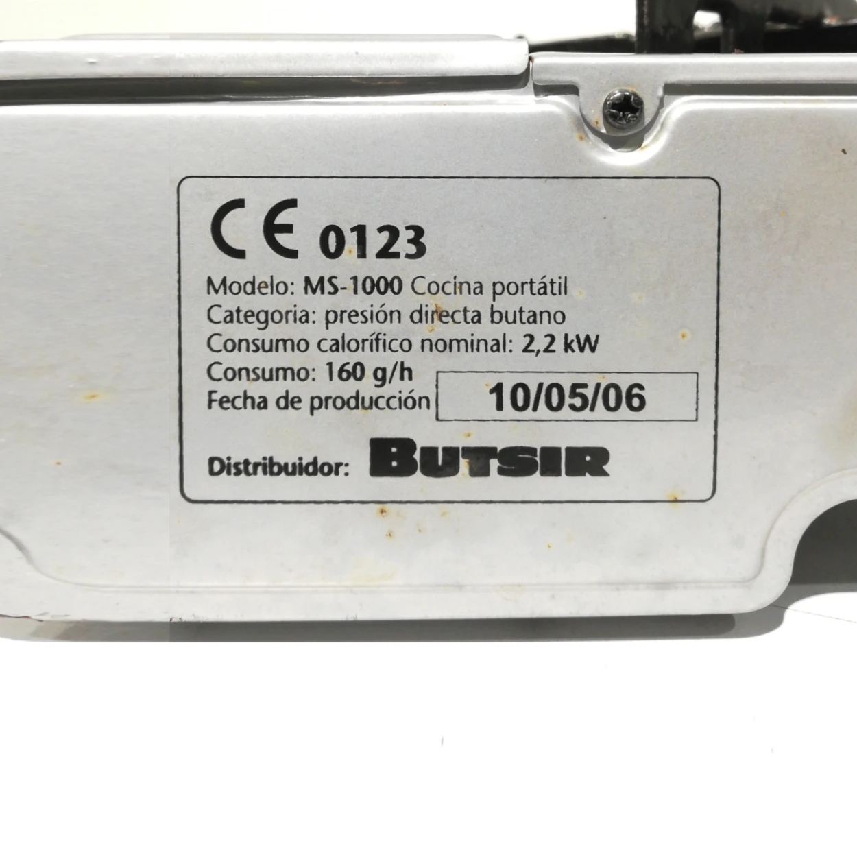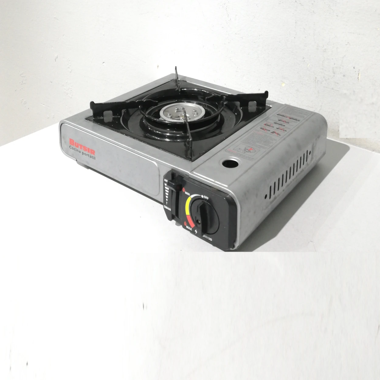 Hornillo para carga de camping gas procedente de una empresa en cierre.