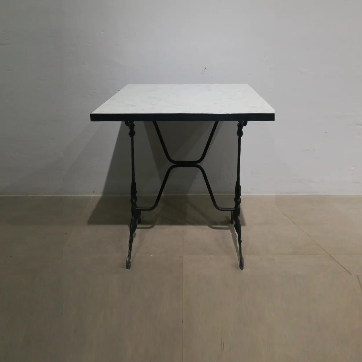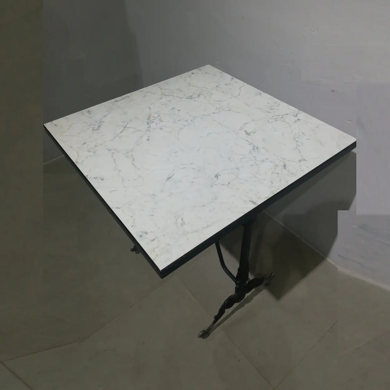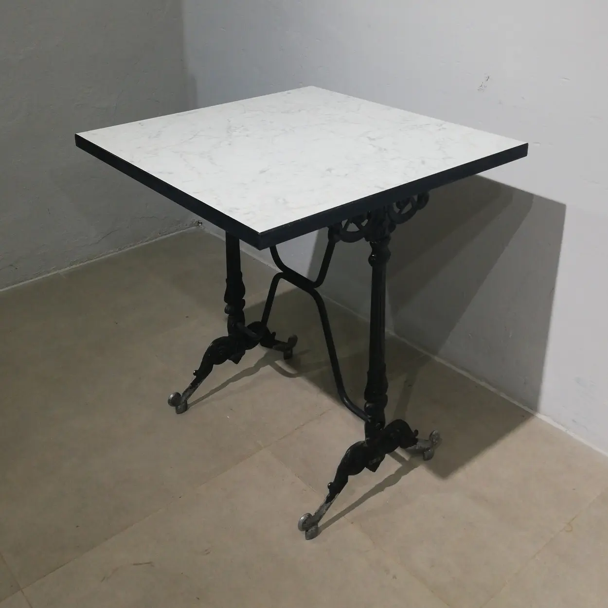 Mesa de ocasión procedente de una empresa en cierre perfecta para bar, restaurante, hotel… con patas tipo hierro fundido y base de fórmica marbreada.