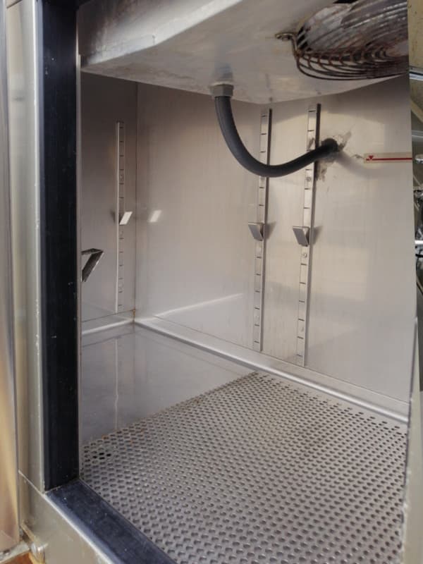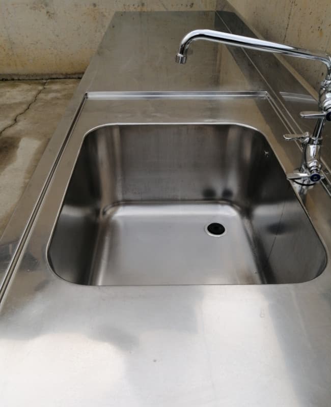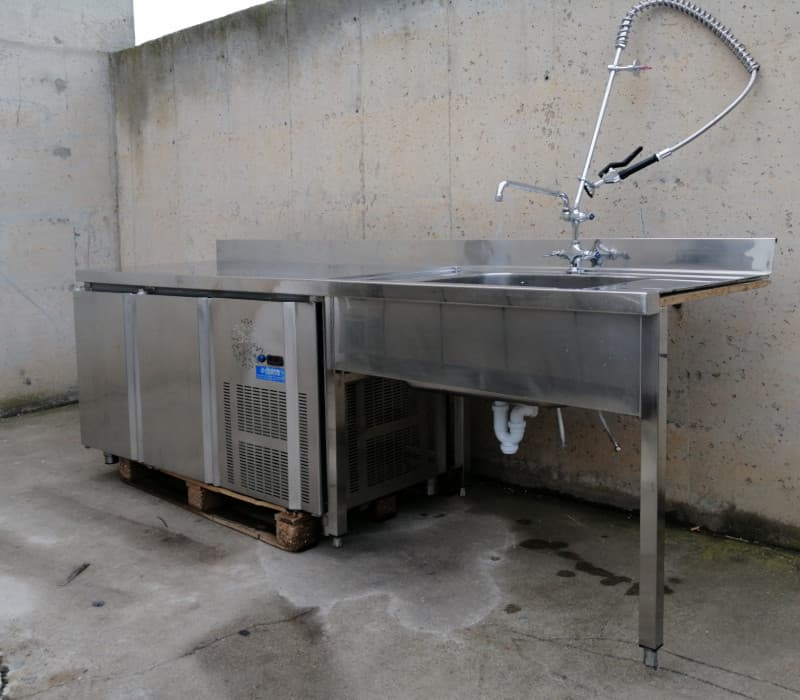 Fregadero con patas y frigorífico bajomostrador de segunda mano procedente de una empresa en cierre.