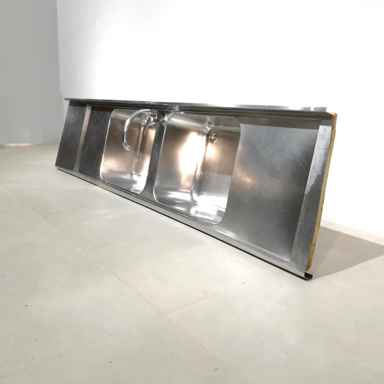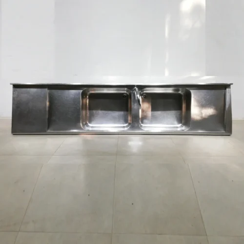 Mesa de trabajo sin patas de ocasiรณn fabricada con acero inoxidable con dos fregaderas y grifo perfecta tanto para uso profesional en bar, restaurante, cocina comunitaria… como para uso domรฉstico.