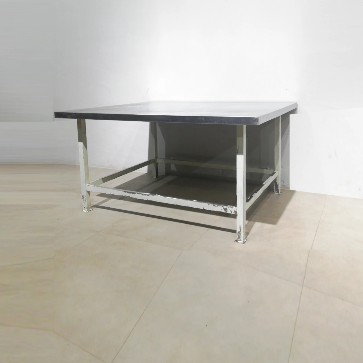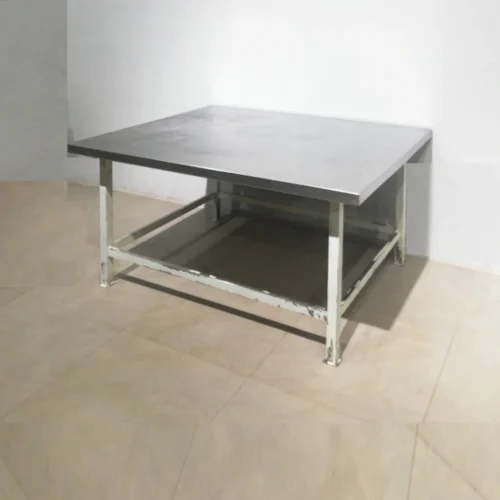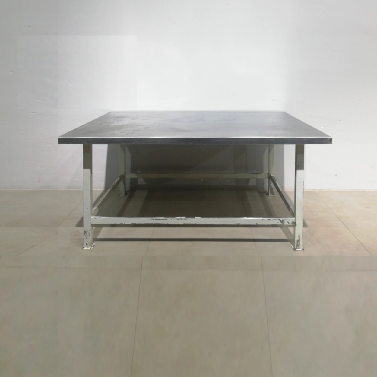 Mesa con base de acero inoxidable de ocasiรณn, procedente de una empresa en cierre perfecta para tienda, taller, bar…