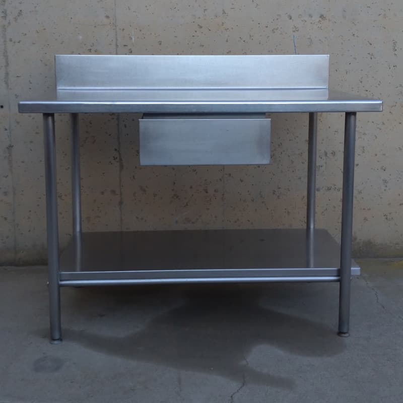 Mesa de acero inoxidable con un cajรณn central y estante en la parte inferior para aprovechar el espacio.