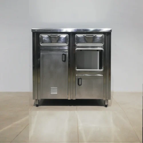 Mueble para cafetera de ocasiรณn, fabricado con chapa de acero inoxidable de alta calidad y resistencia y amplio espacio de almacenamiento. Le falta el cajรณn del poso.