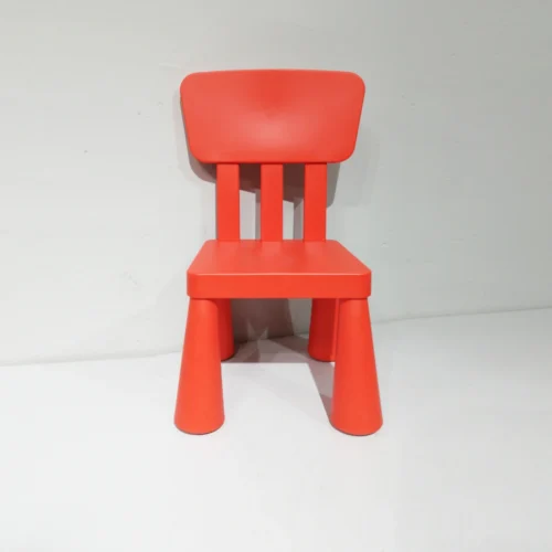 Silla infantil de plástico rojo para interiores y exteriores, ligera y fácil de transportar.