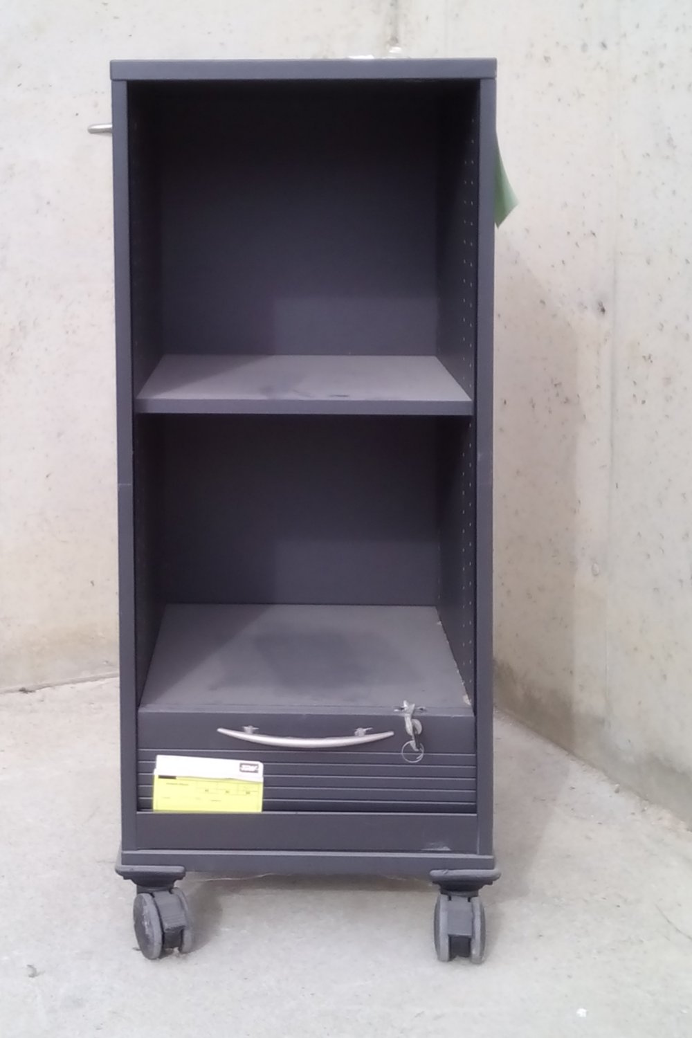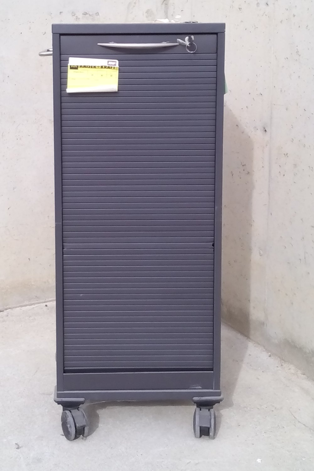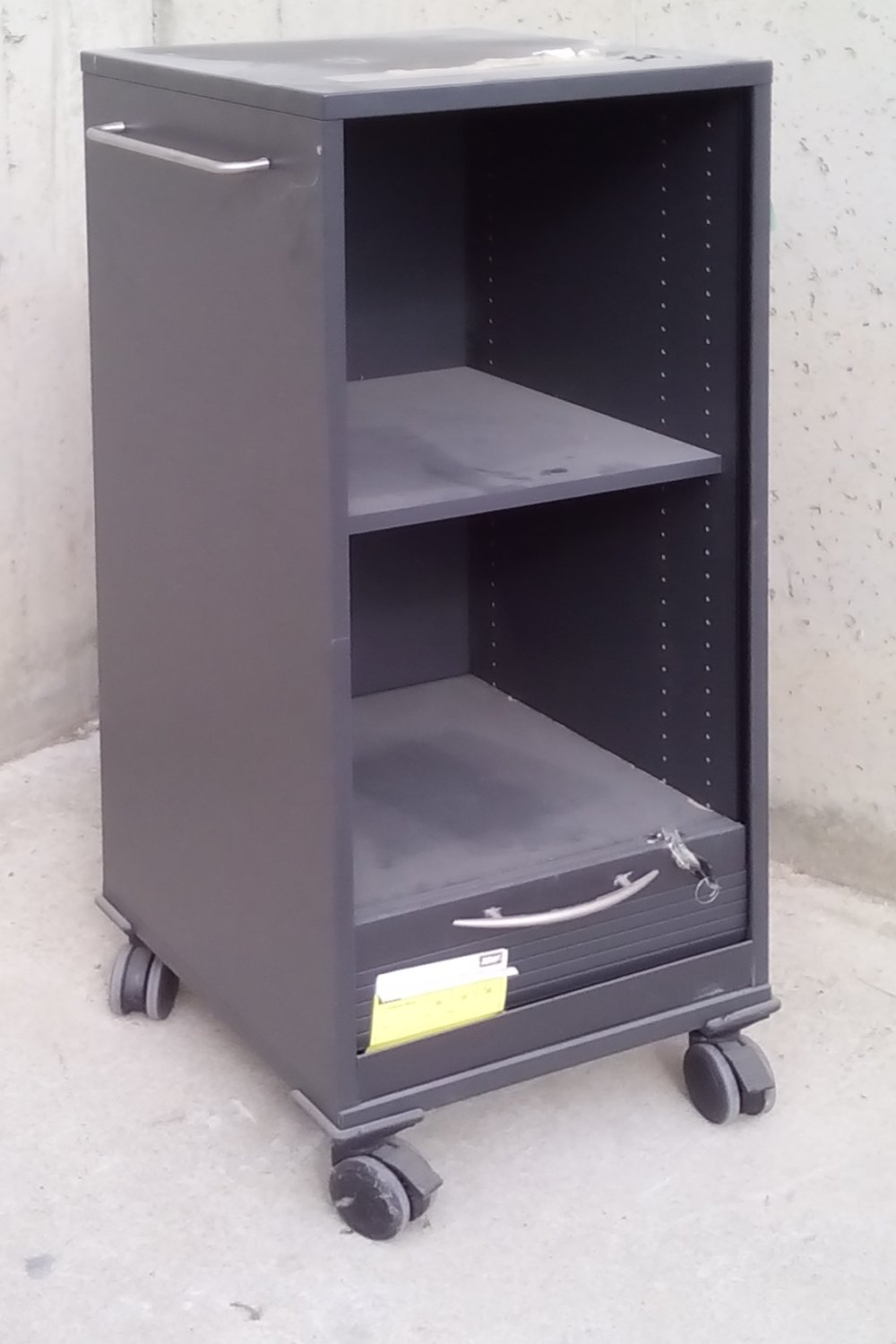 Armario con ruedas, una estanterรญa y puerta en persiana.