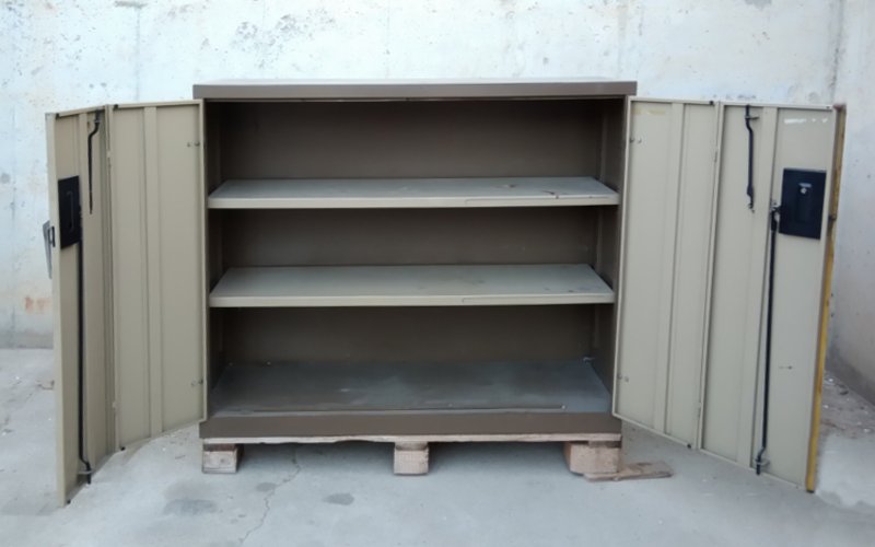 Armario metálico de segunda mano, con dos estantes.