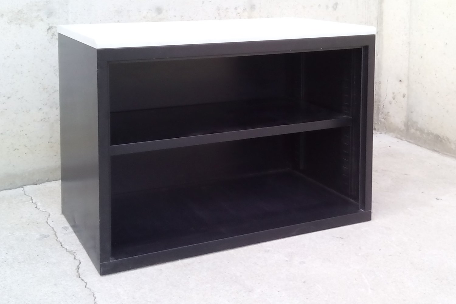 Estantería sin puertas, con tablero de madera gris en la parte superior.