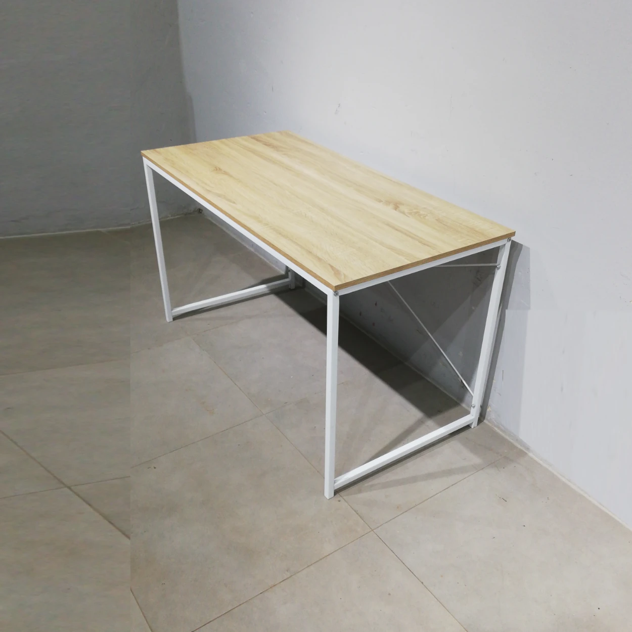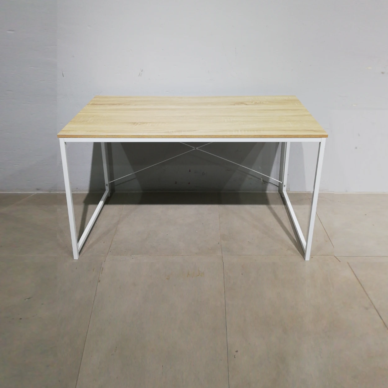 Mesa de oficina de ocasión procedente de una empresa en cierre, con estructura de acero y base de melamina.