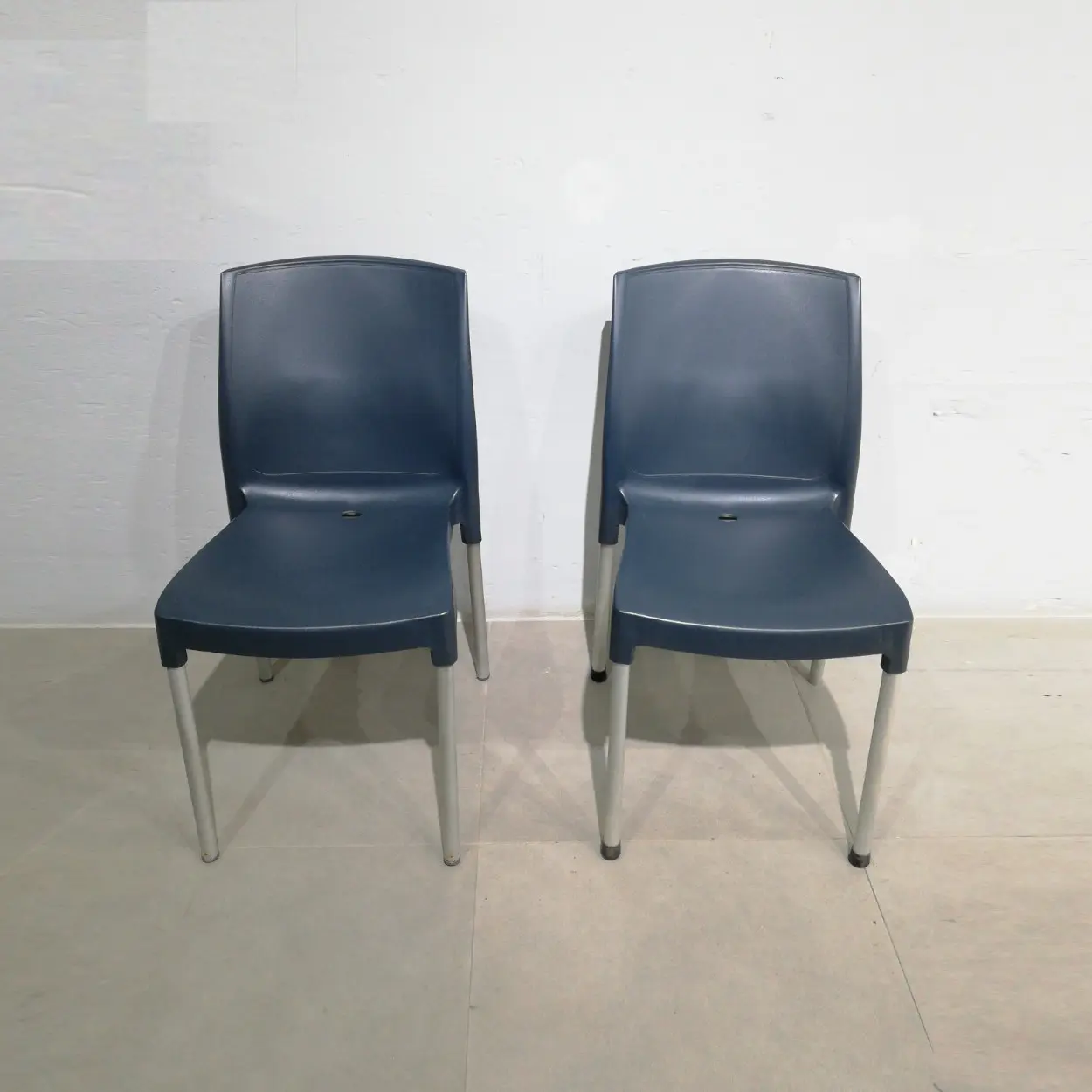 Lote de 2 sillas apilables de plástico con patas metálicas de ocasión perfectas para uso doméstico de gran comodidad, resistencia y calidad.