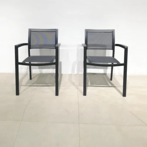 Silla apilable hecha de estructura de aluminio de cloro negro y asiento de textileno perfecta tanto para uso doméstico como profesional.