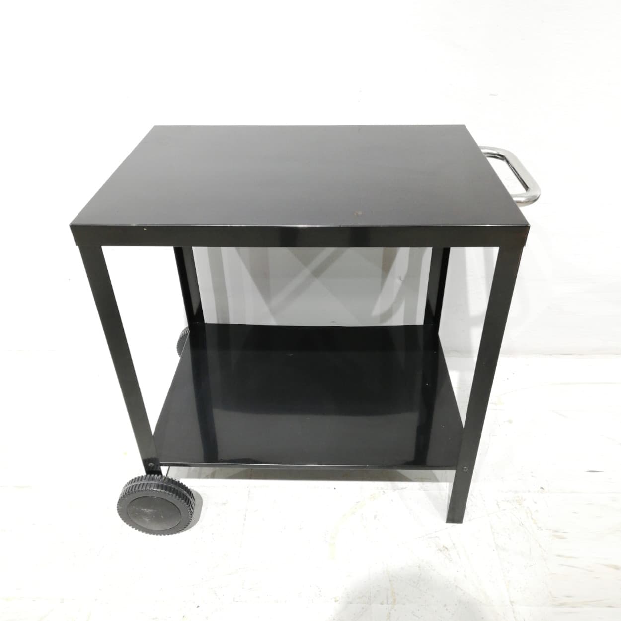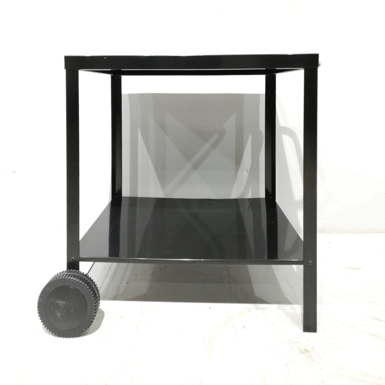 Carro de color negro con dos niveles fabricado con chapa de acero de gran calidad y resistencia.