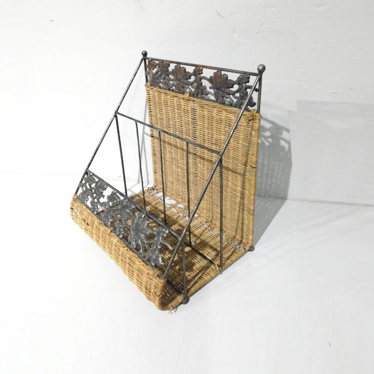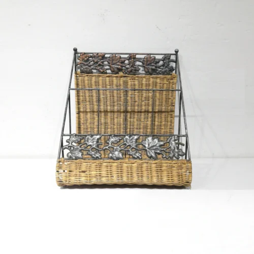 Porta-revistes d’ocasió feta de vímet i metall perfecte per a decorar en casa o oficina.