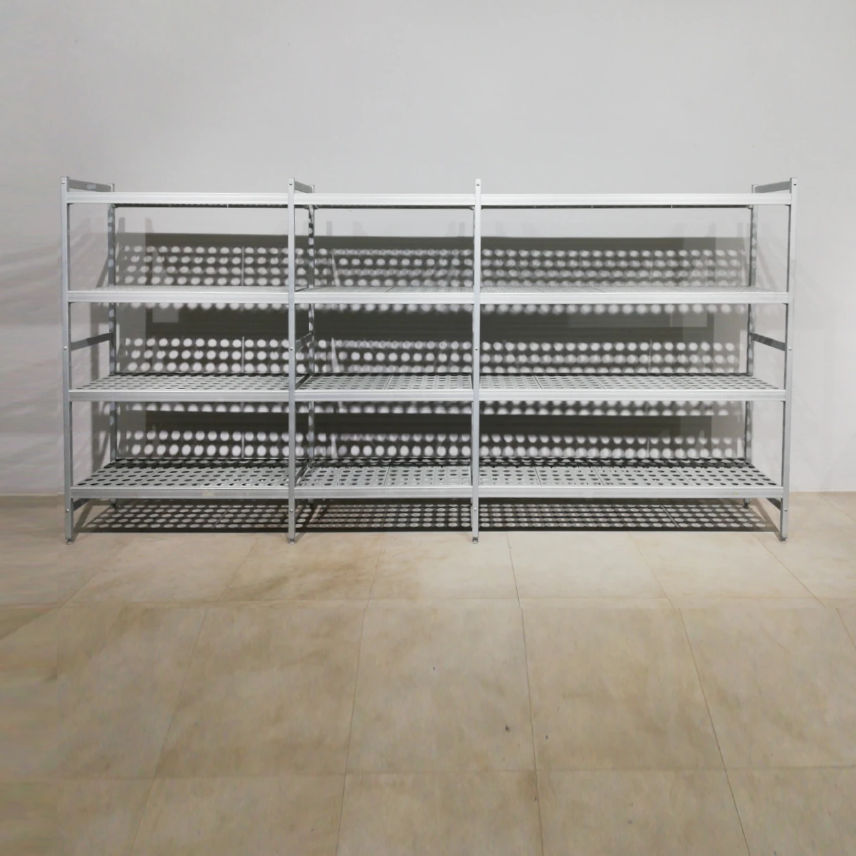 Prestatgeria d’alumini i posts de plàstic per a cambra frigorífica de gran qualitat i resistència.