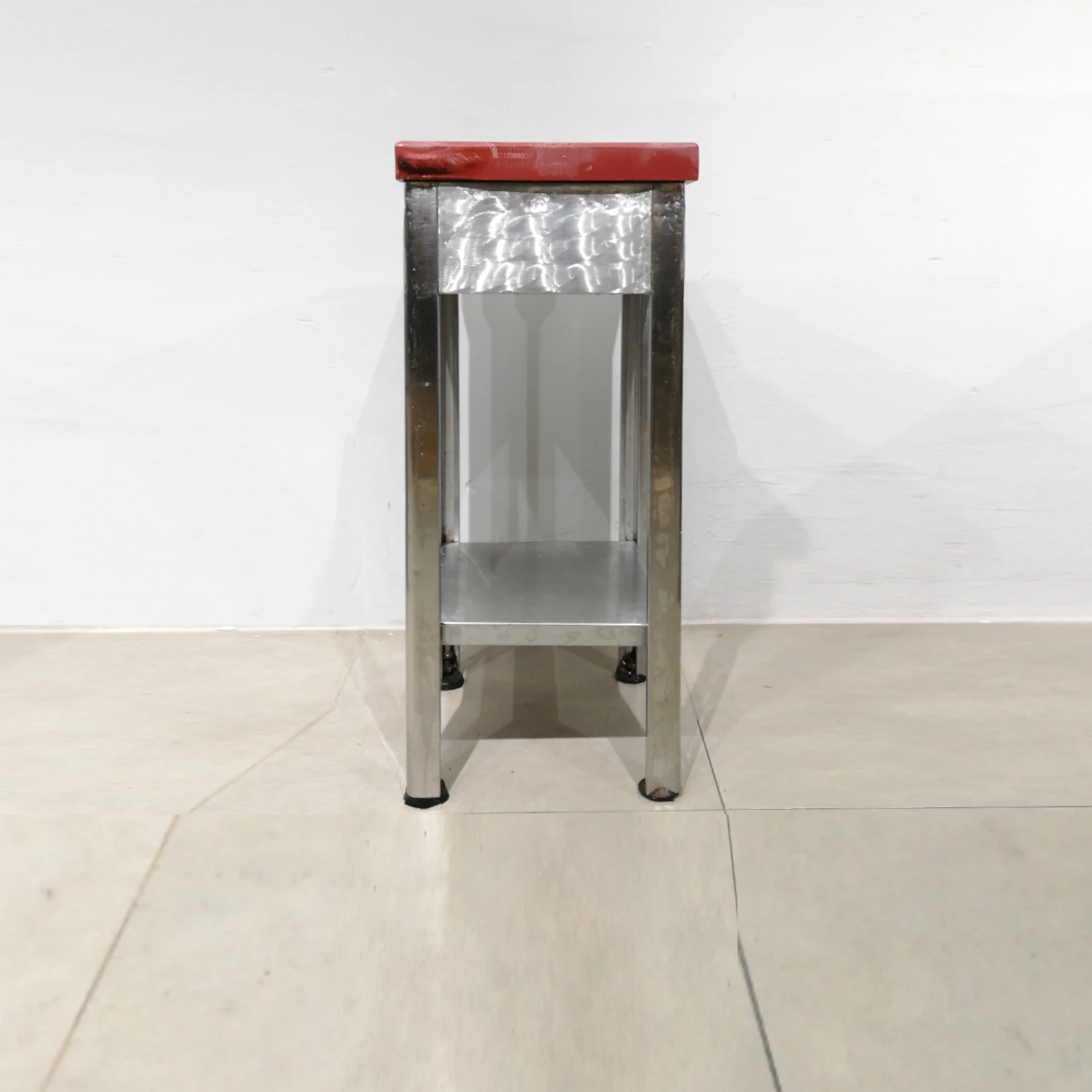 Piló d’ocasió procedent d’una empresa en tancament fet de tub d’acer amb una base de polietilè vermell, perfecta per a carnisseria, restaurant, obrador alimentari…