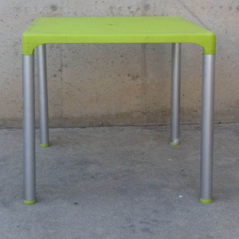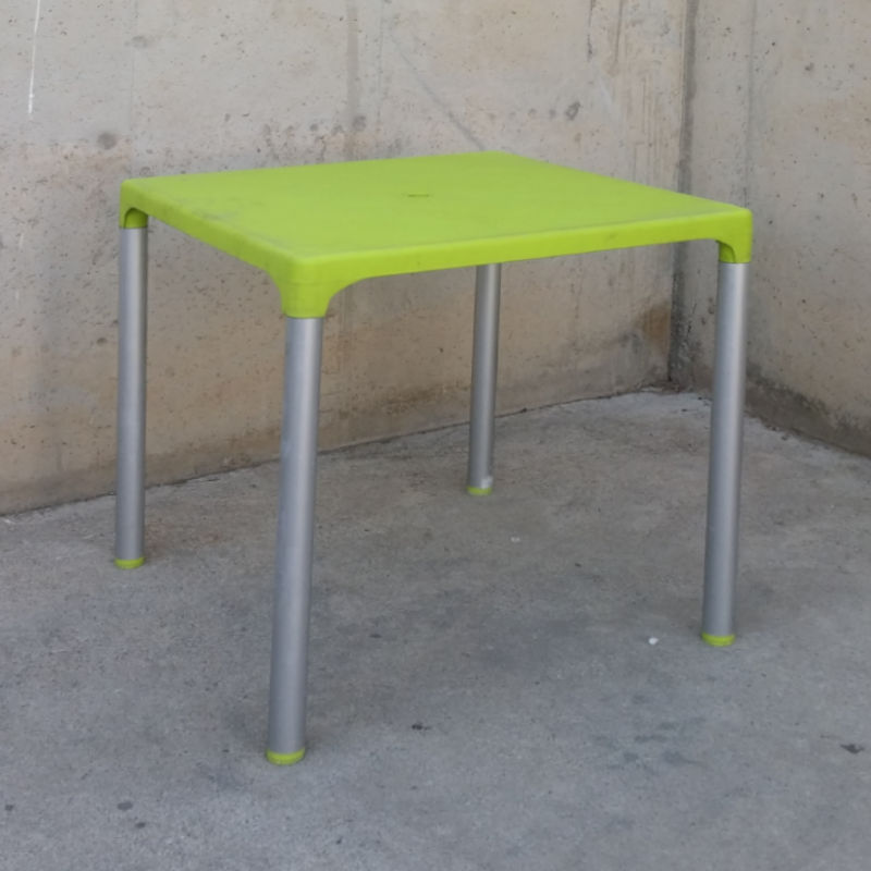Taula de terrassa d’alumini i plร stic en bon estat.