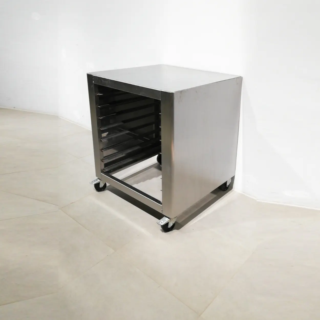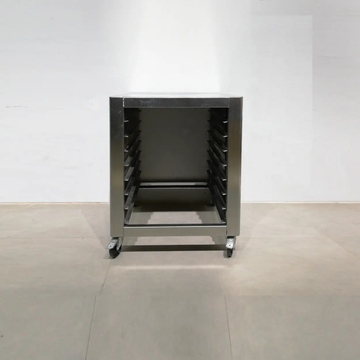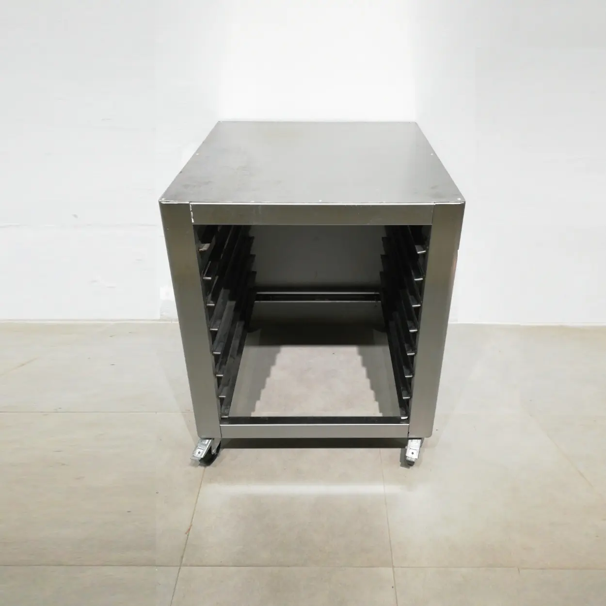 Suport amb rodes d’acer inoxidable per a forn amb espai per a 8 safates en molt bon estat perfecte per a hostaleria i restauració.