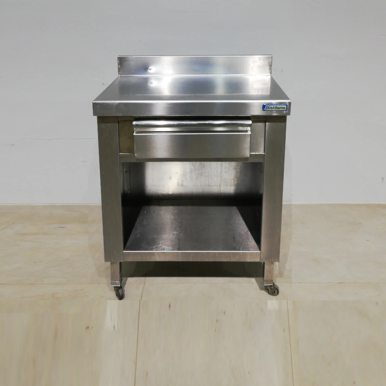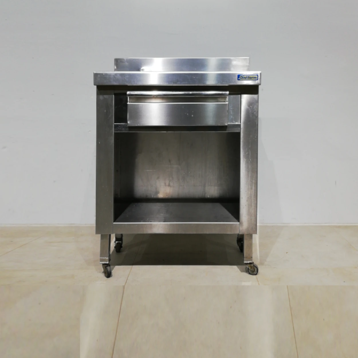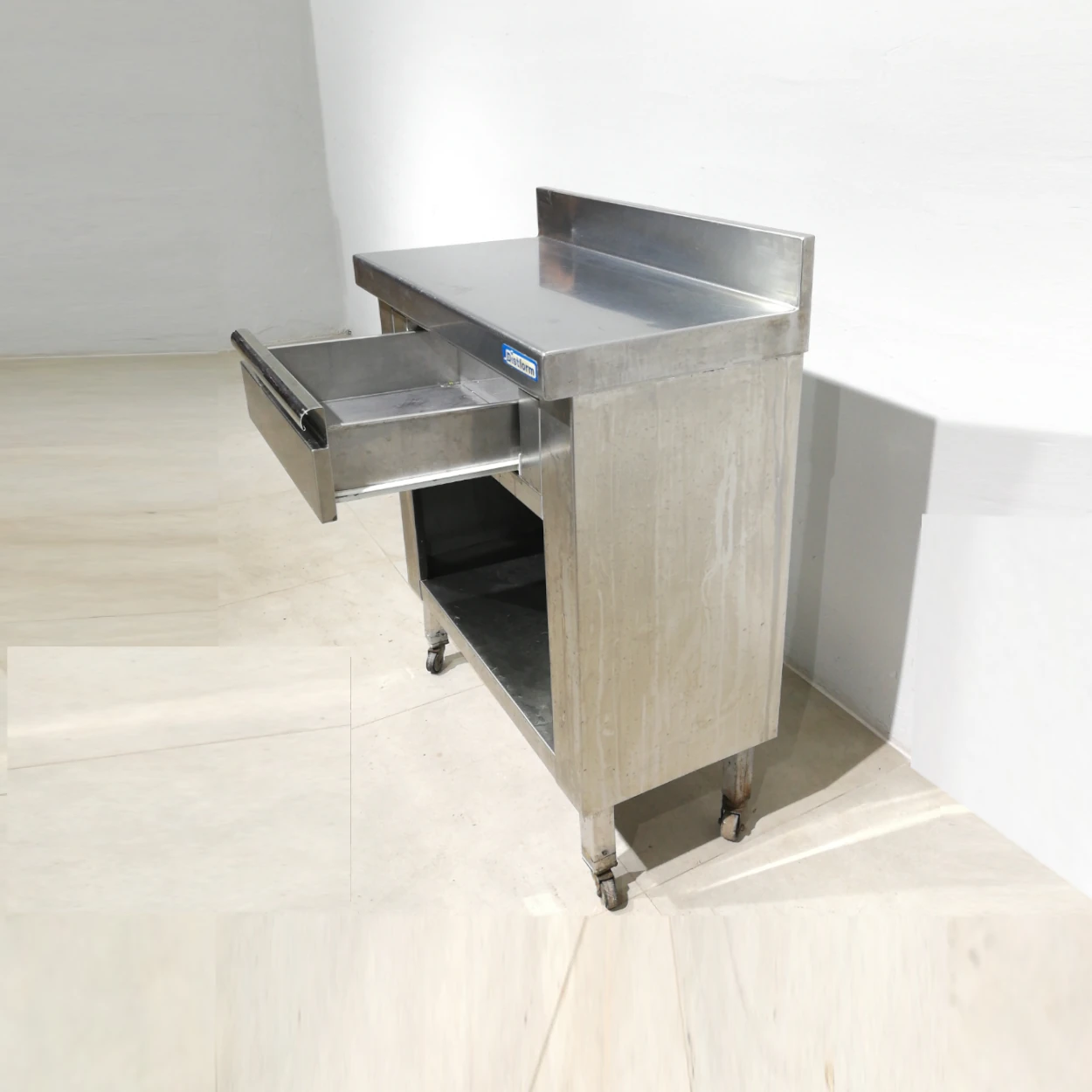 Taula d’acer inoxidable d’ocasió amb rodes i calaix, procedent d’una empresa en tancament perfecta per a botiga, taller, bar…