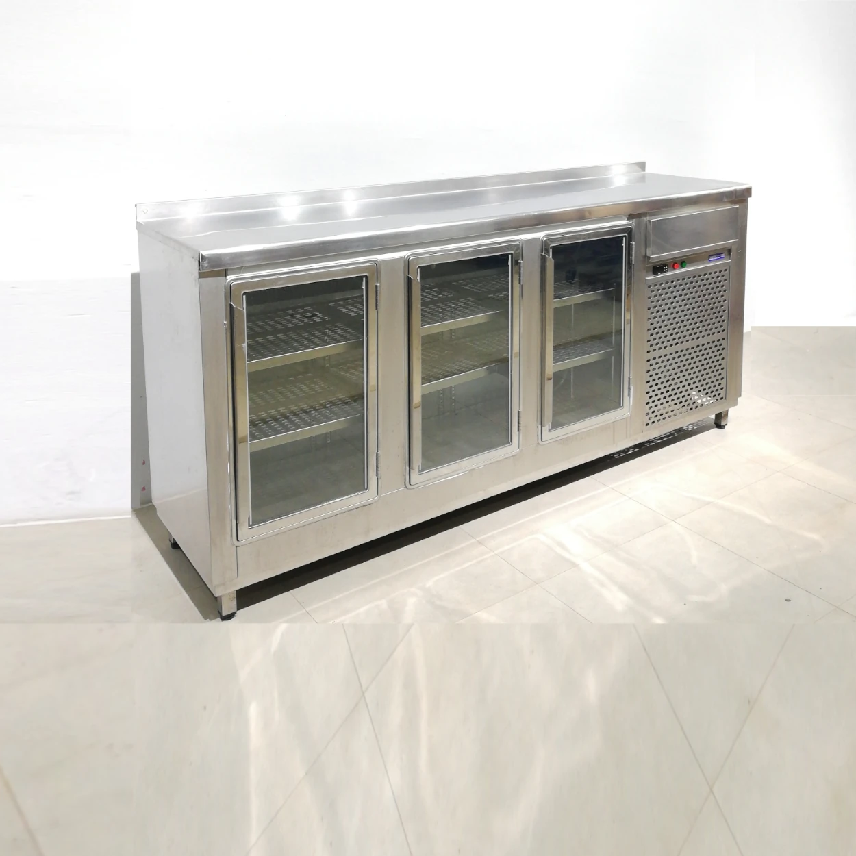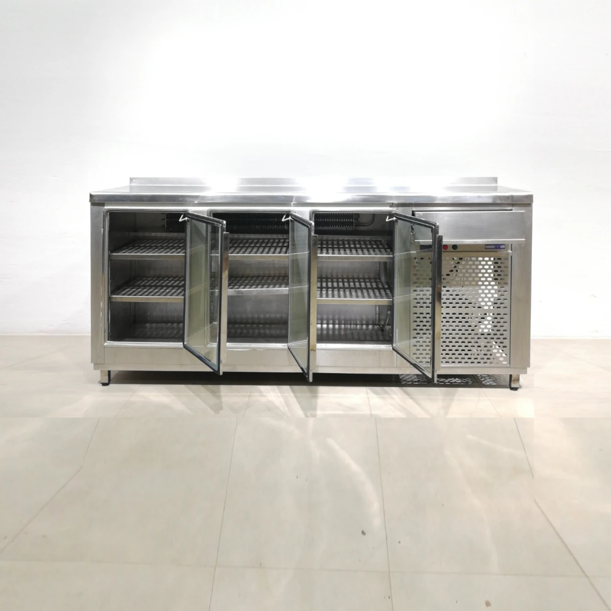 Expositor refrigerat d’acer inoxidable amb portes de vidre en bon estat perfecta per a bar, restaurant, hotel…