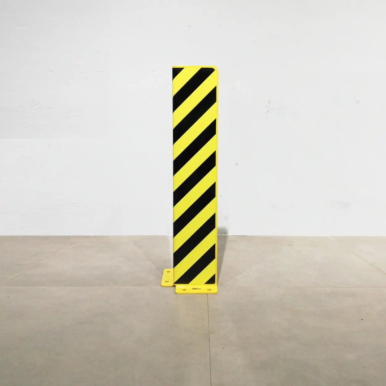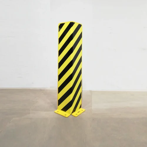 Protecció d’acer amb senyalització d’advertència de color negre i groc.