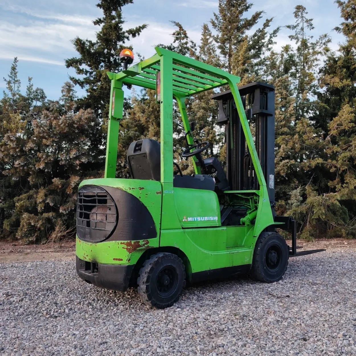 Carregador elevador d’elevació lliure de 1.500kg de capacitat, amb masteler triple de 450cm (4.5m) d’alçada d’elevació amb motor MITSUBISHI, repassat, en bon estat.