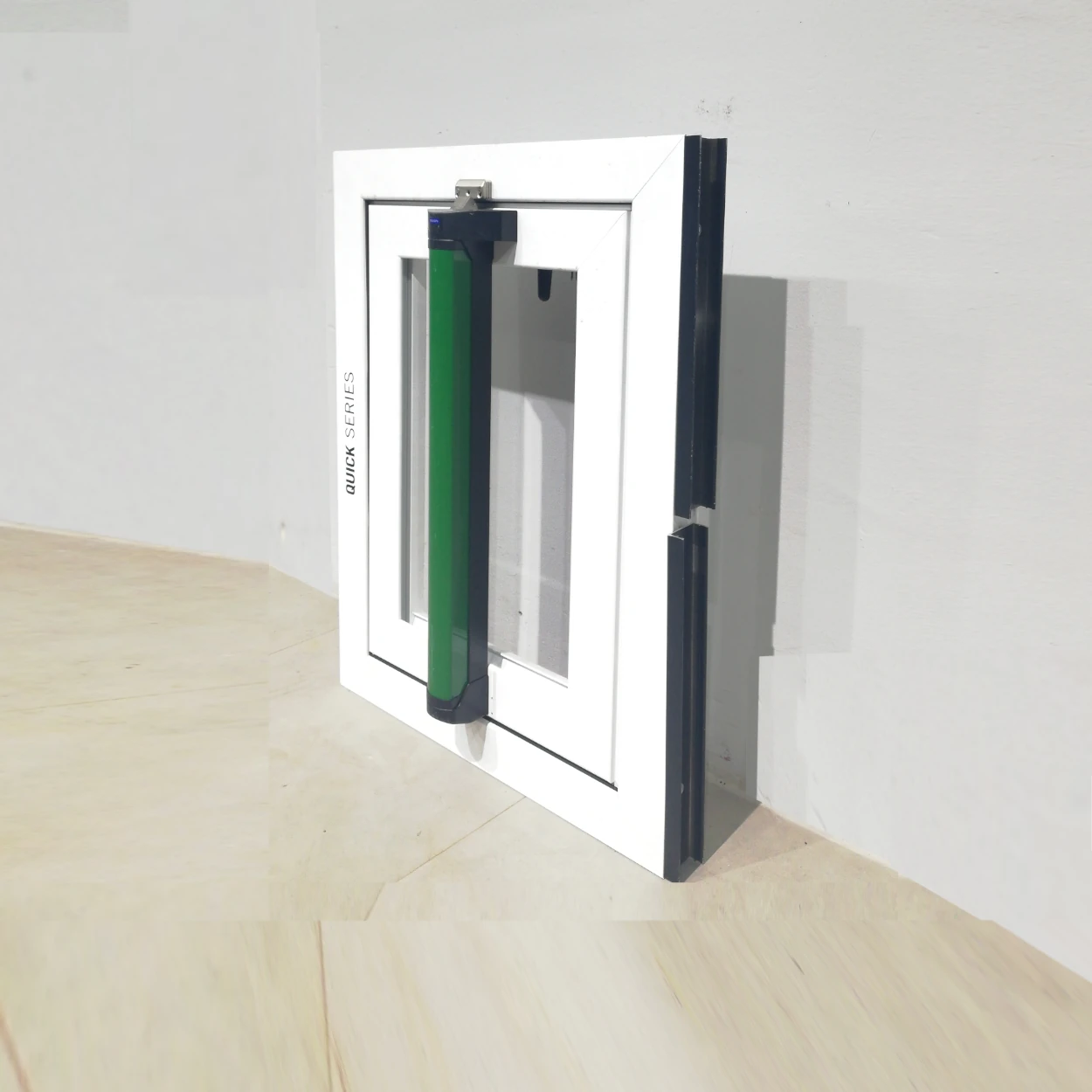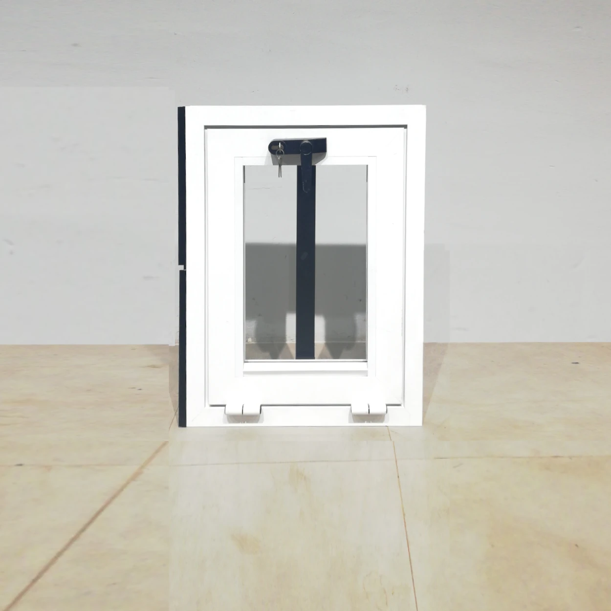 Finestra d’ocasió de PVC amb marc sense vidre, barra d’obertura i xapa de seguretat, procedent d’una empresa en tancament.