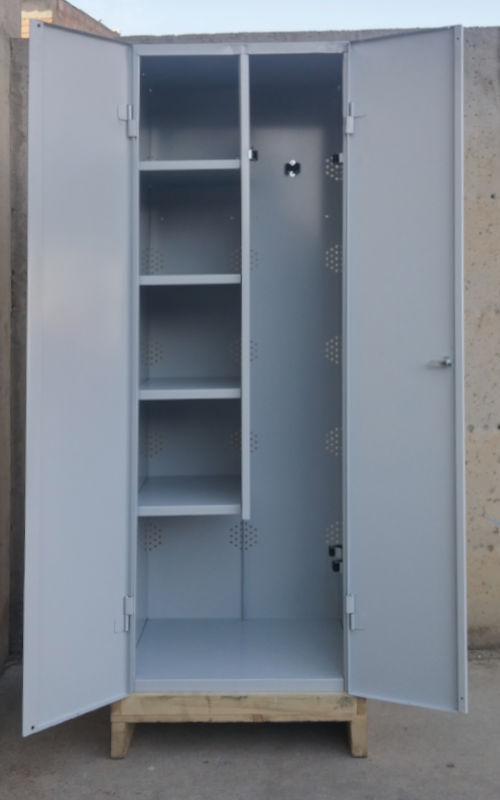 Armari metàl·lic nou pensat per a emmagatzemar les eines de neteja.