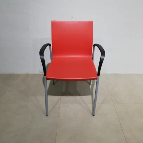 Cadira feta d’estructura d’acer i entapissat vermell.