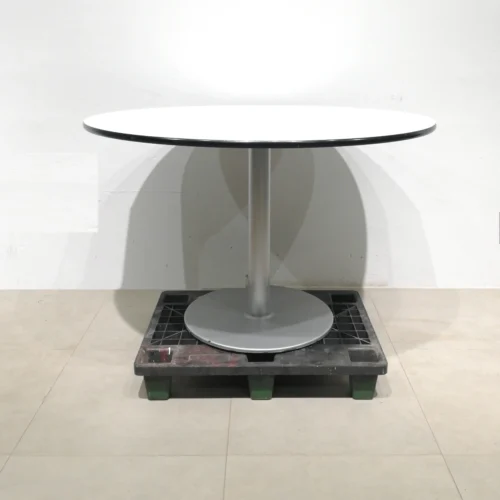 Taula rodona de gran qualitat i resistència amb pota d’acer i base de melamina.