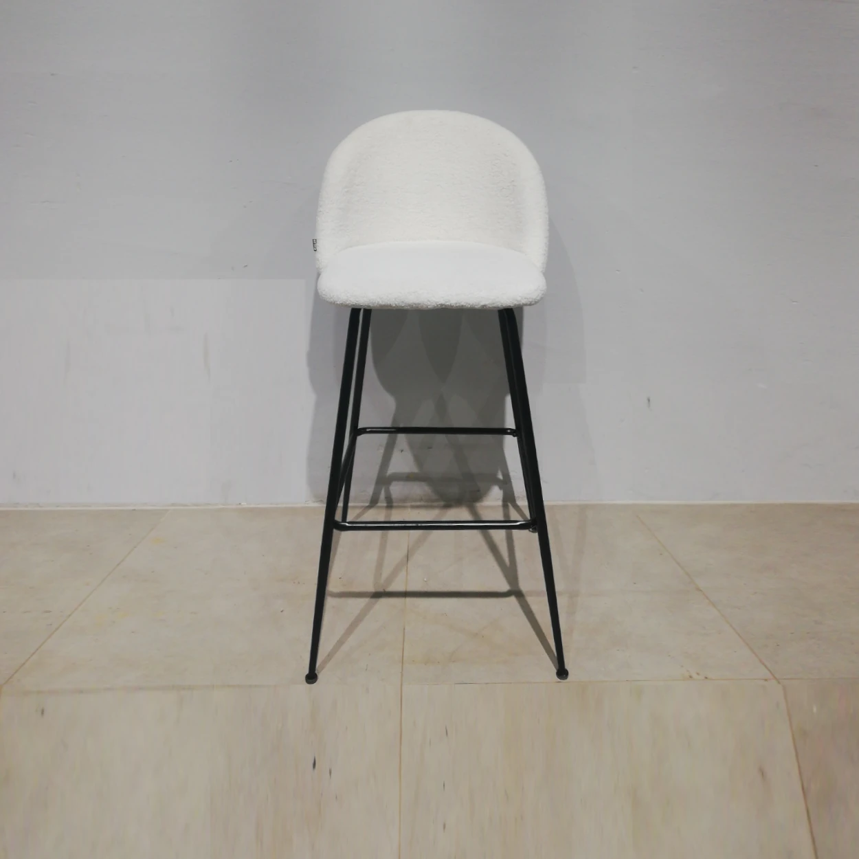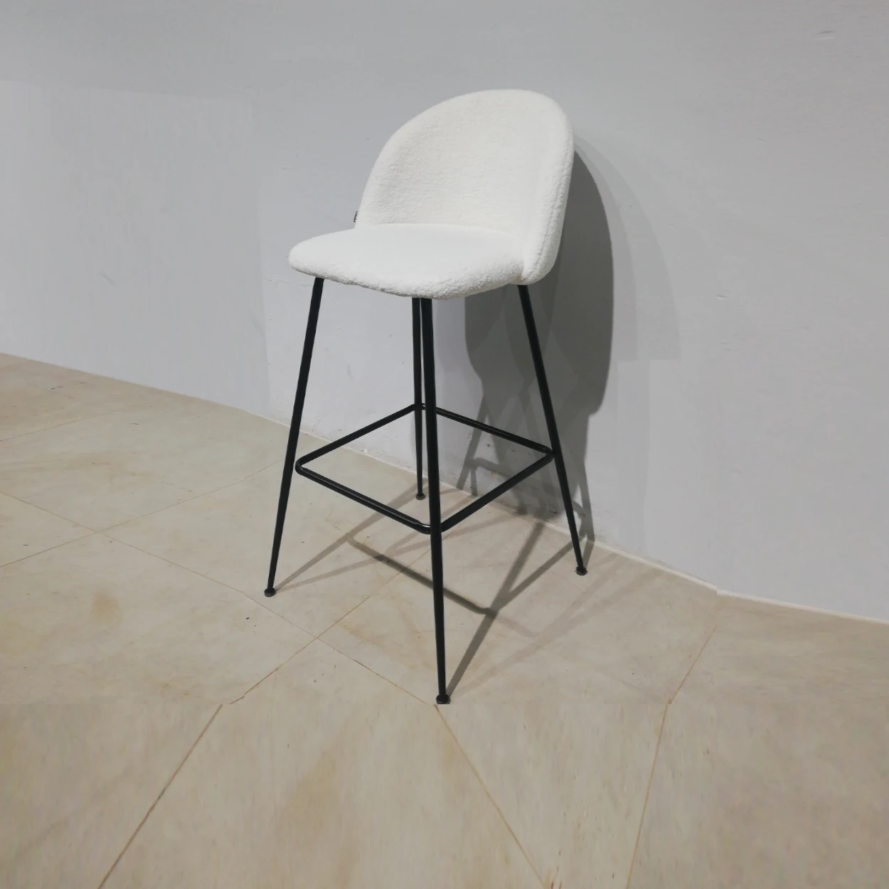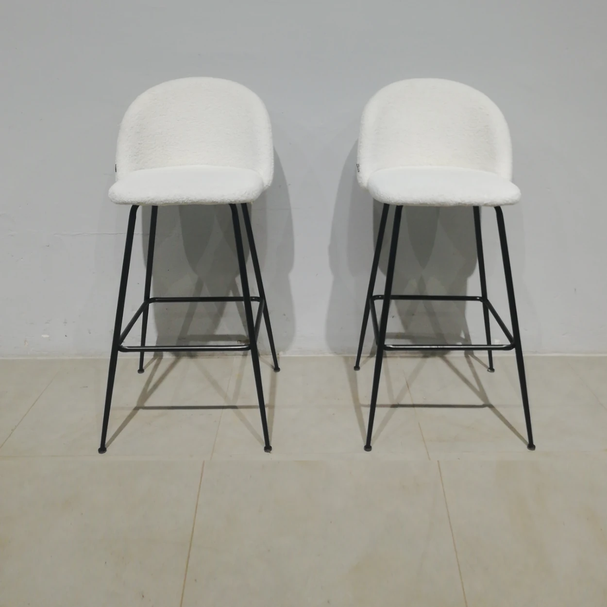 Tamboret d’ocasió amb potes de tub d’acer negre i entapissat amb llana blanca en bon estat.