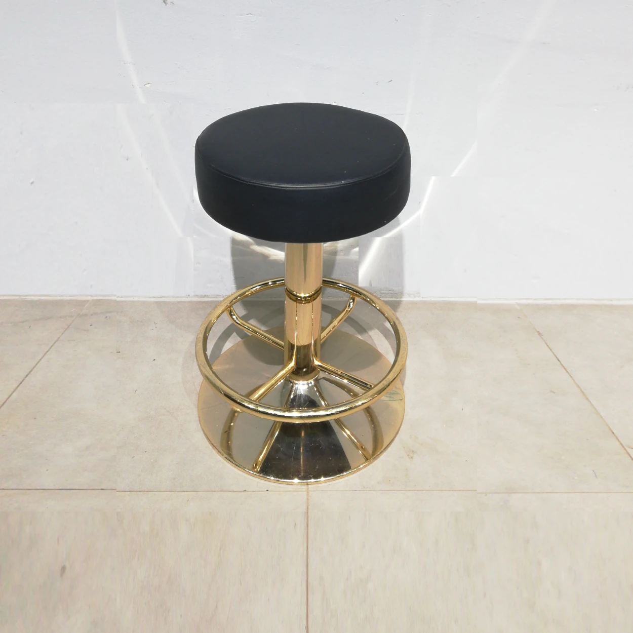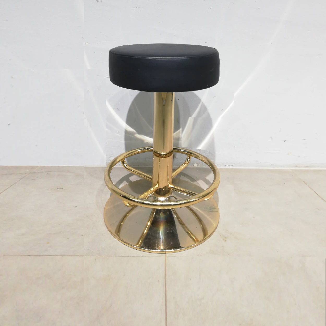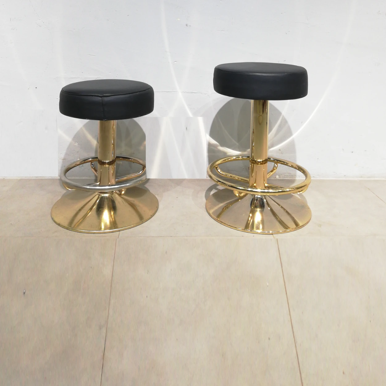 Tamborets de pell negra i peu daurat d’ocasió procedents d’una empresa en tancament.