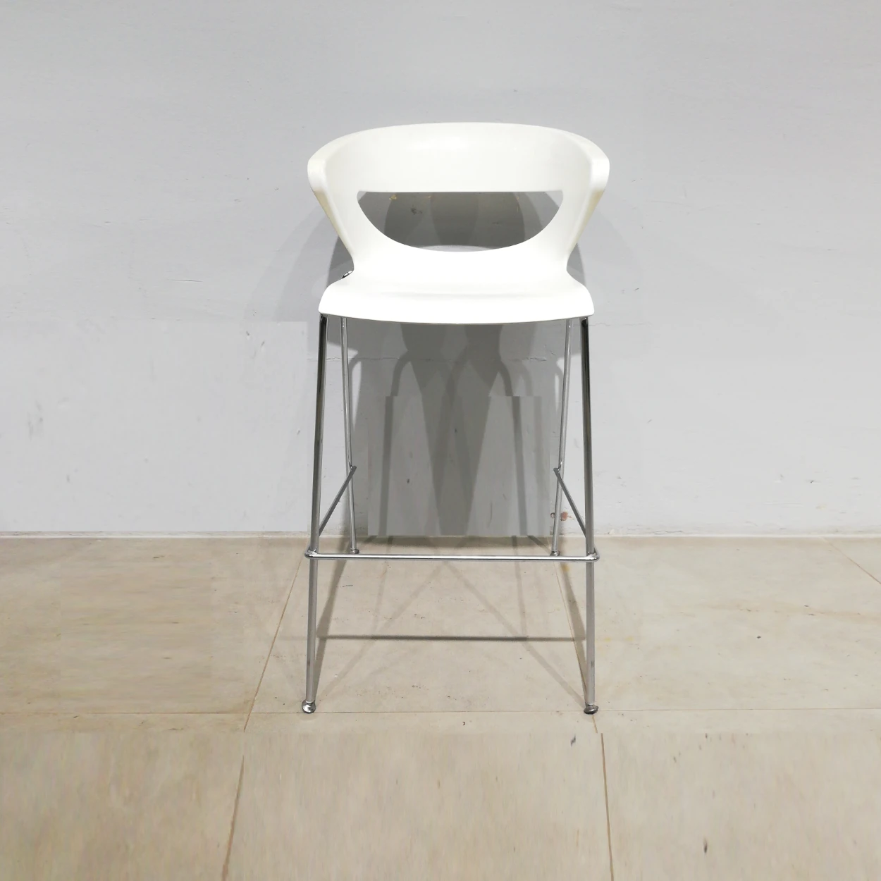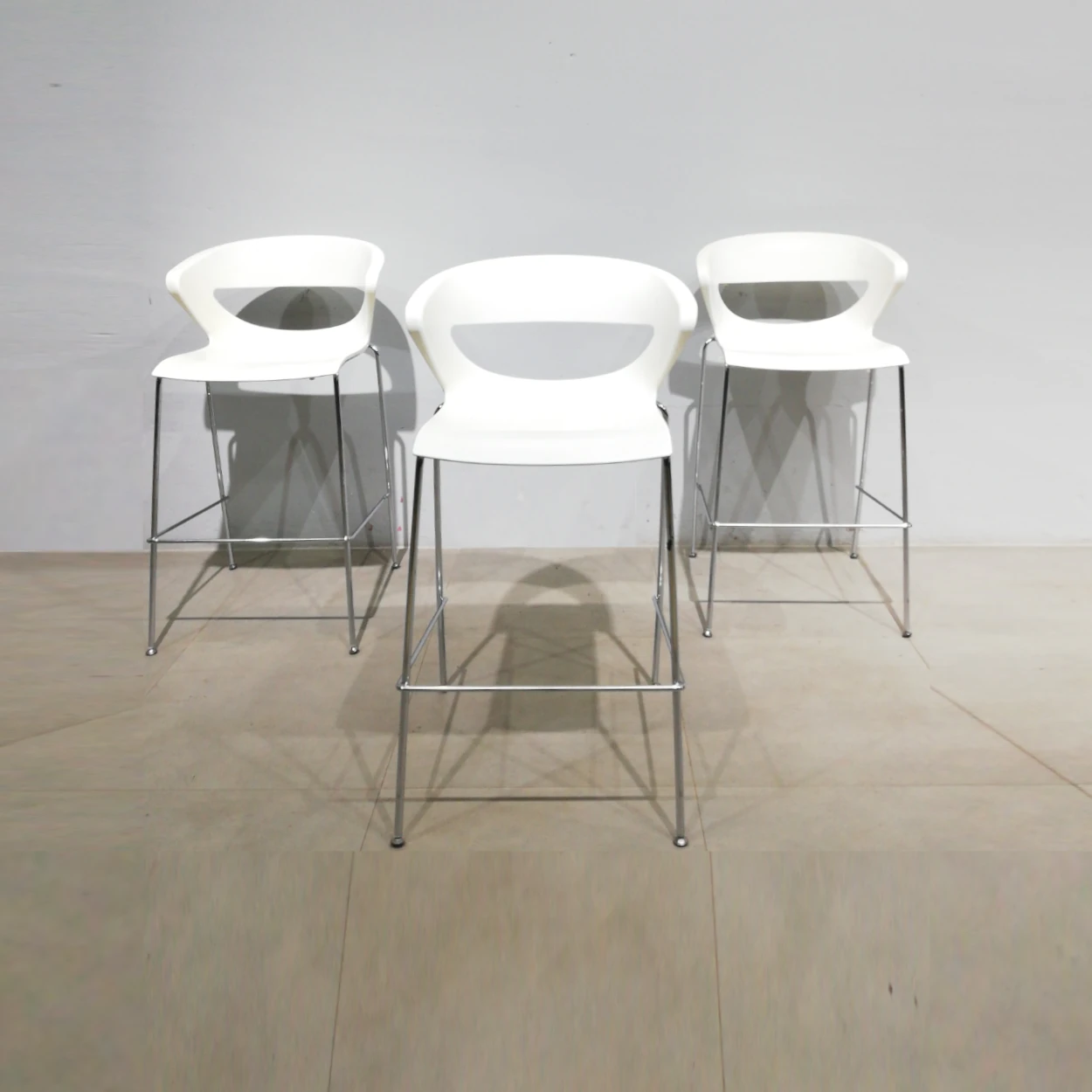 Tamborets d’ocasió fets de plàstic blanc i potes de tub d’acer en bon estat.