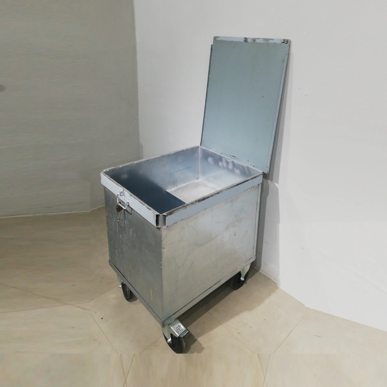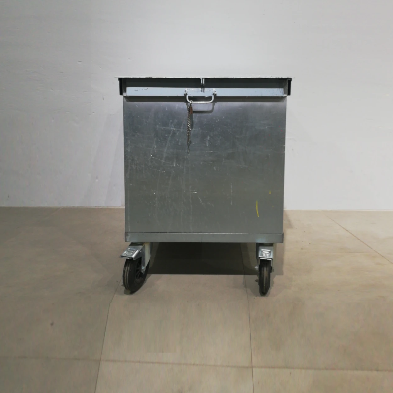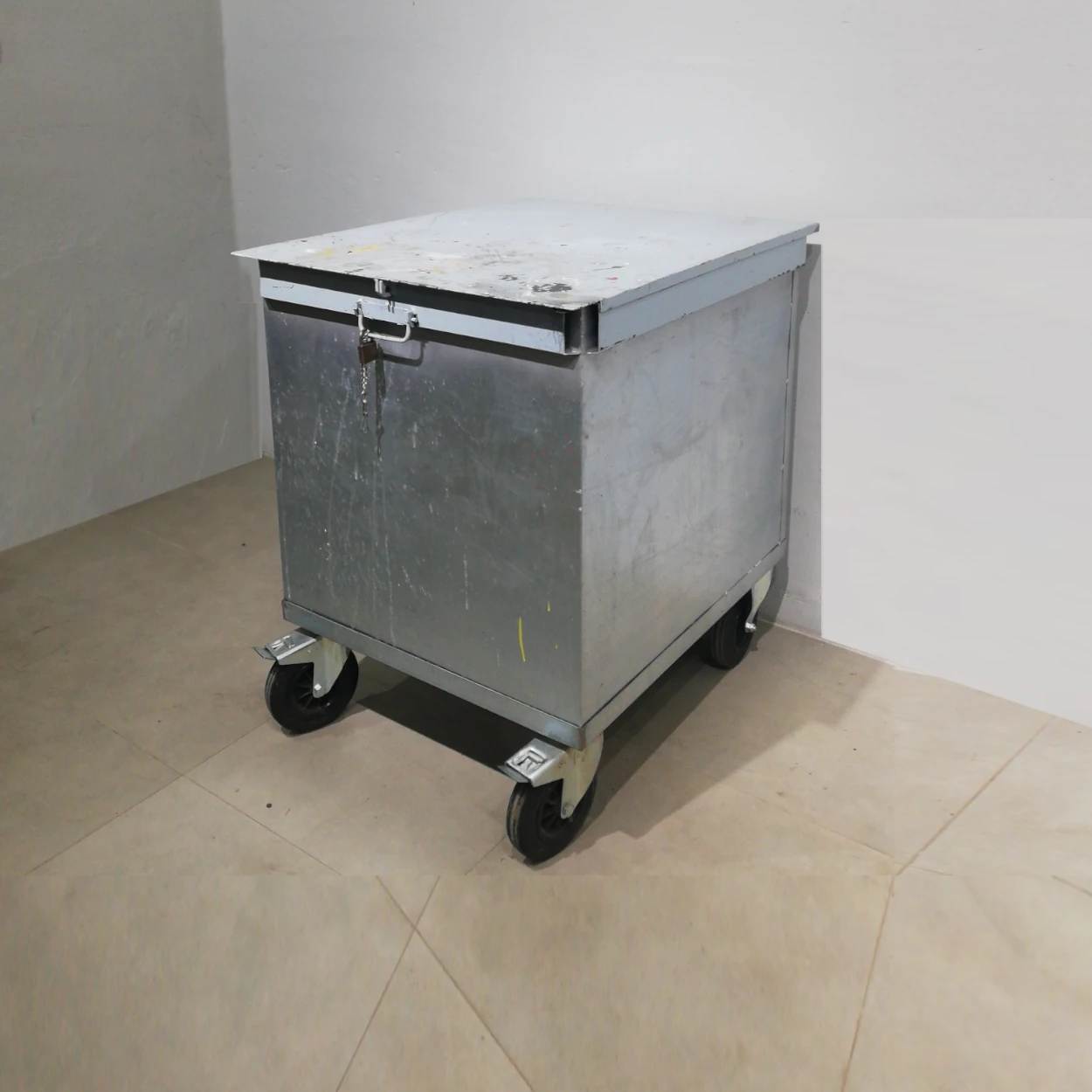 Carro contenidor amb rodes d’ocasió fet de xapa d’acer perfecte tant per a ús domèstic com professional.